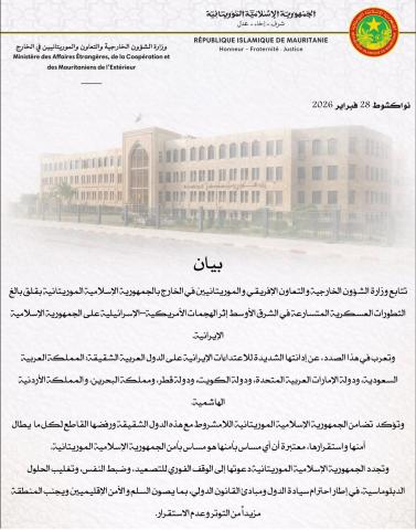 أجرى فخامة رئيس الجمهورية، السيد محمد ولد الشيخ الغزواني، اليوم الأحد، اتصالا هاتفيا بأخيه صاحب السمو الشيخ محمد بن زايد آل نهيان، رئيس دولة الإمارات العربية المتحدة الشقيقة، وذلك على إثر الاعتداءات الصاروخية التي استهد