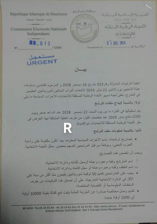 أعلنت اللجنة الوطنية المستقلة للانتخابات عن فتح باب الترشح لانتخاب نواب الموريتانيين في الخارج خلال الفترة ما بين 22 دجمبر 2018 وحتى فاتح يناير 2019 .