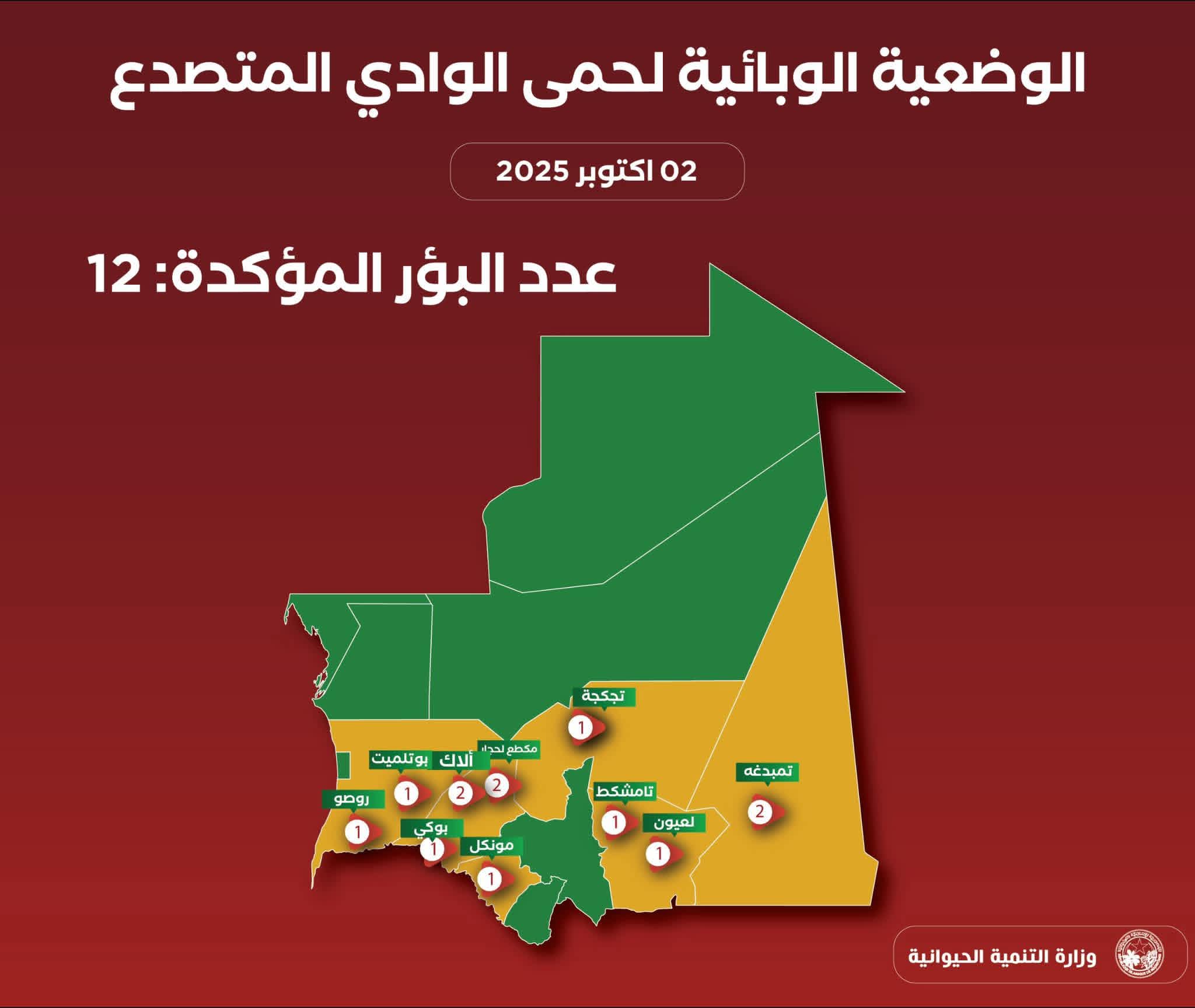 وقد سجلت المصالح البيطرية ، حتى اليوم 2 اكتوبر 2025،ما مجموعه 12بؤر موزعة على 10 مقاطعات تتبع لست ولايات ,كما هو موضح في الصورة.