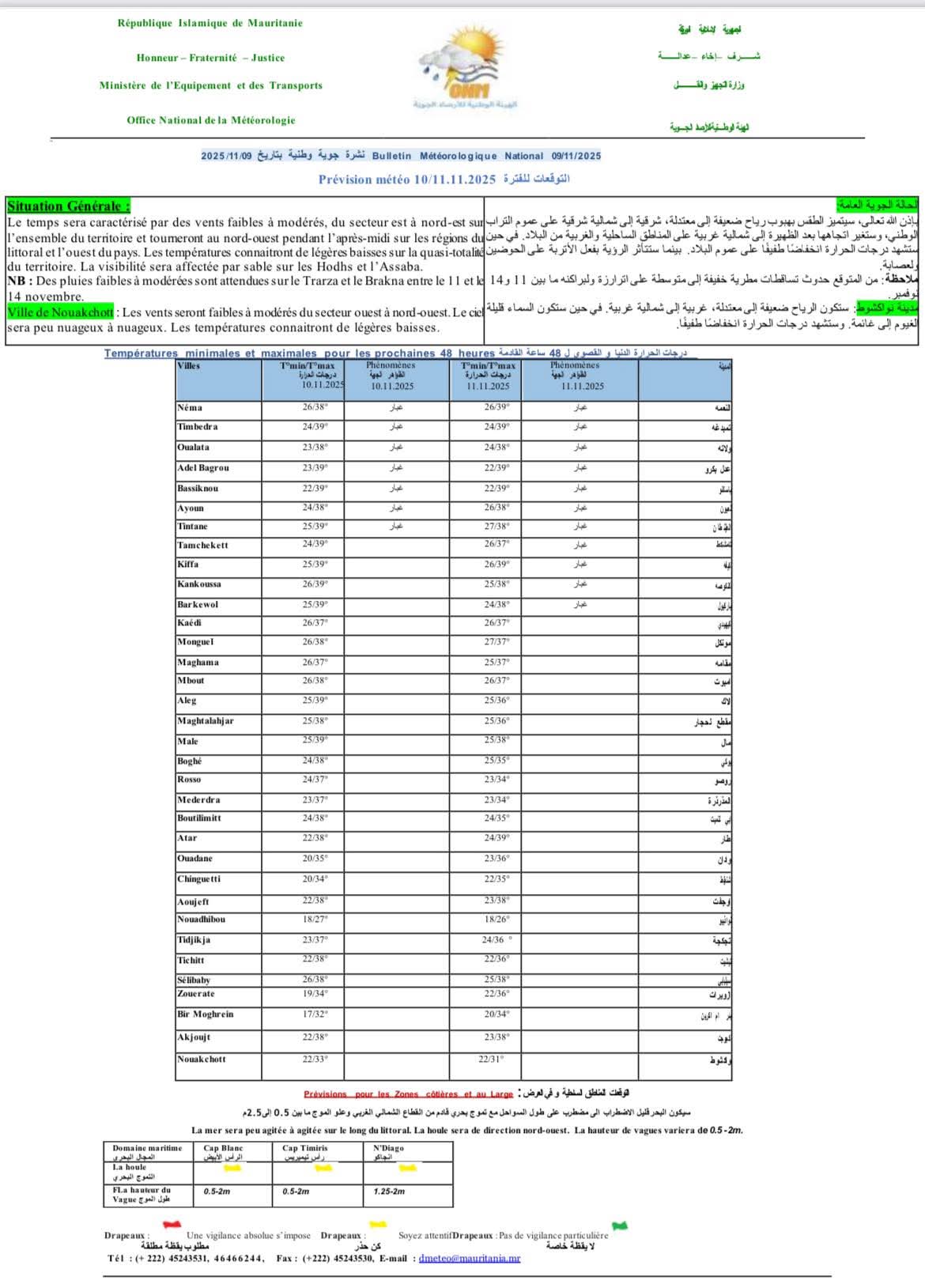 ملاحظة: من المتوقع حدوث تساقطات مطرية خفيفة إلى متوسطة على اترارزة ولبراكنه ما بين 11 و14 نوفمبر.