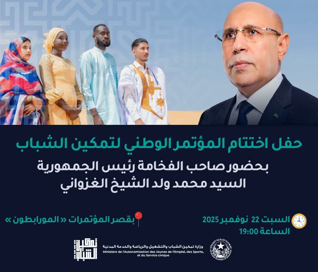 من المقرر أن ينطلق مساء اليوم السبت، في قصر المؤتمرات المرابطون، المؤتمر الوطني لتمكين الشباب؛ وذلك بحضور فخامة رئيس الجمهورية السيد محمد ولد الشيخ الغزواني.