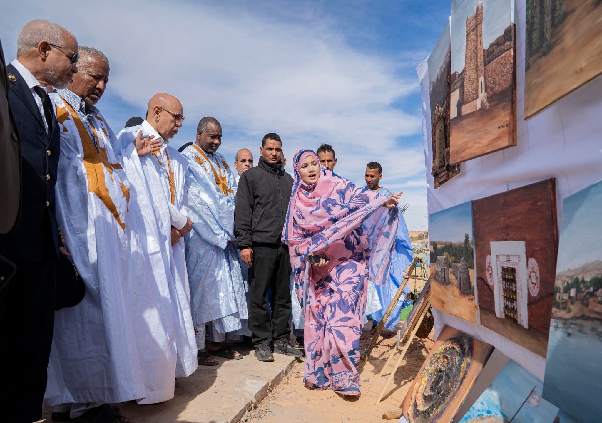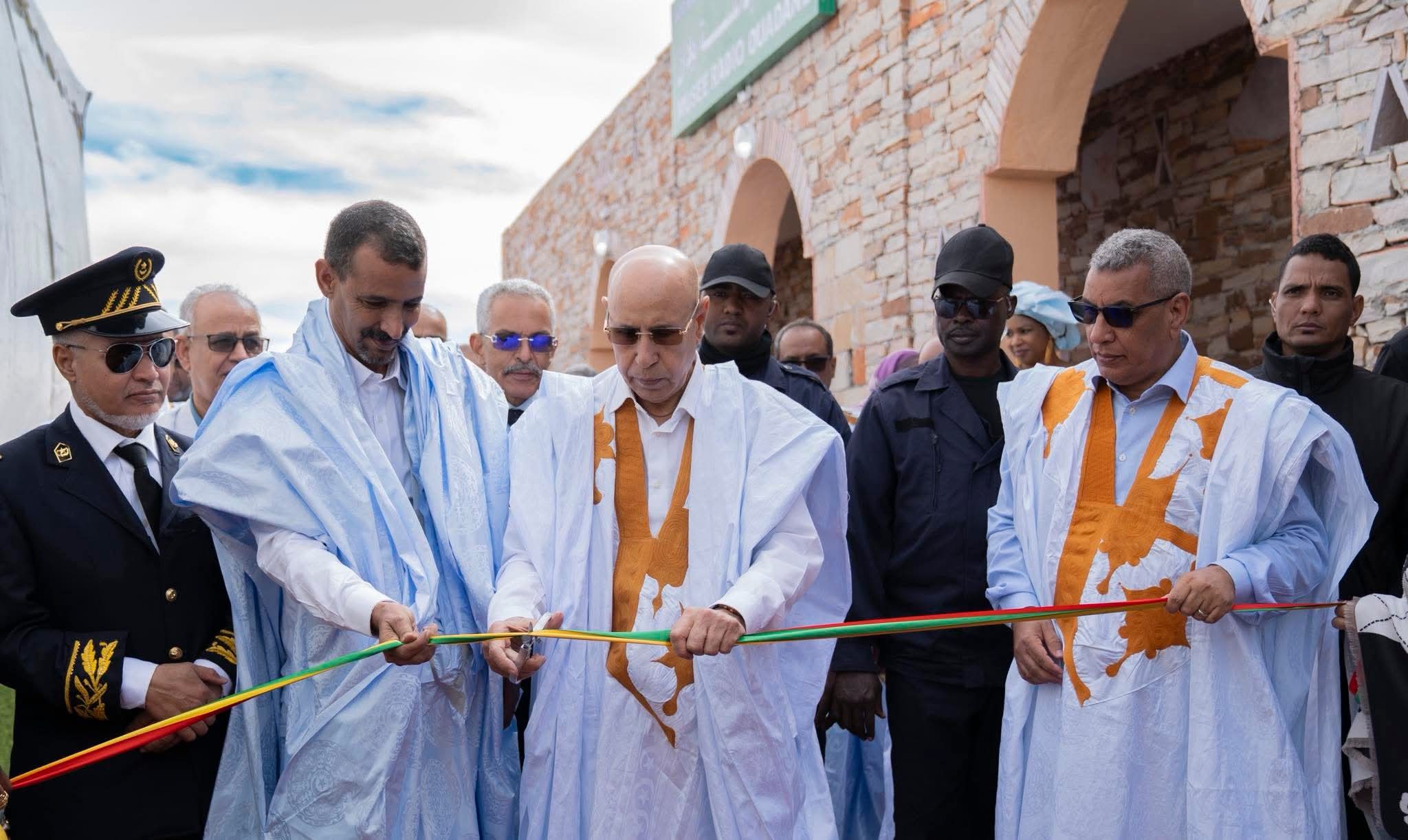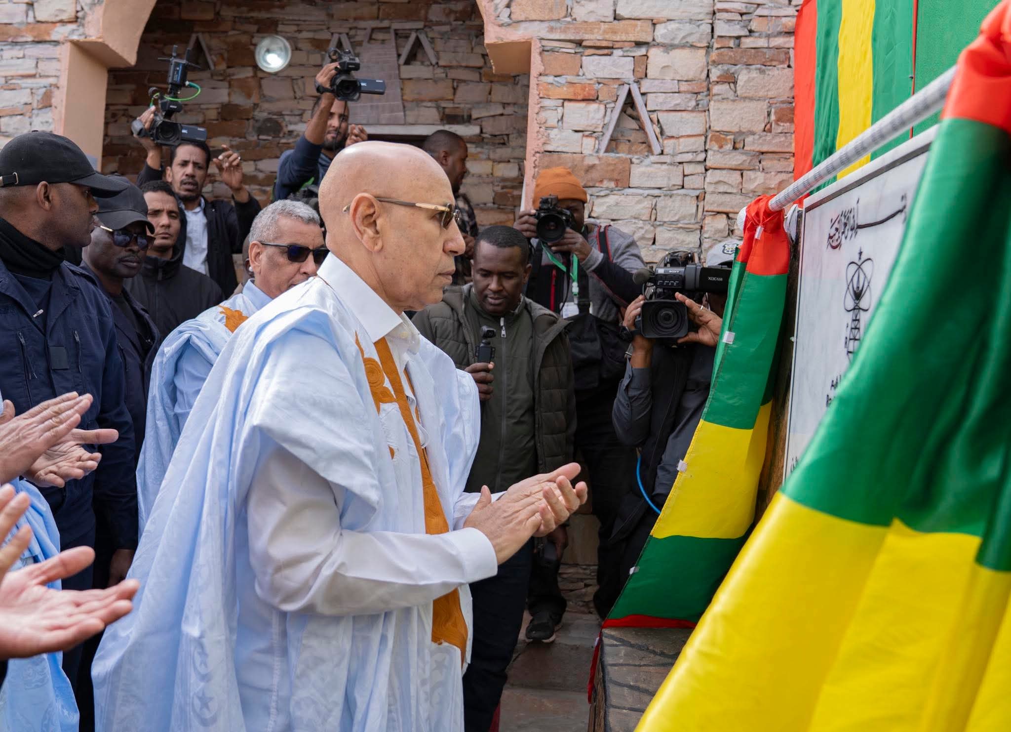 قص فخامة رئيس الجمهورية السيد محمد ولد الشيخ الغزواني؛ الشريط الرمزي؛ وأزاح الستار التذكاري إيذانًا بافتتاح القرية التراثية في مدينة وادان التاريخية؛ بولاية آدرار؛ شمال موريتانيا.