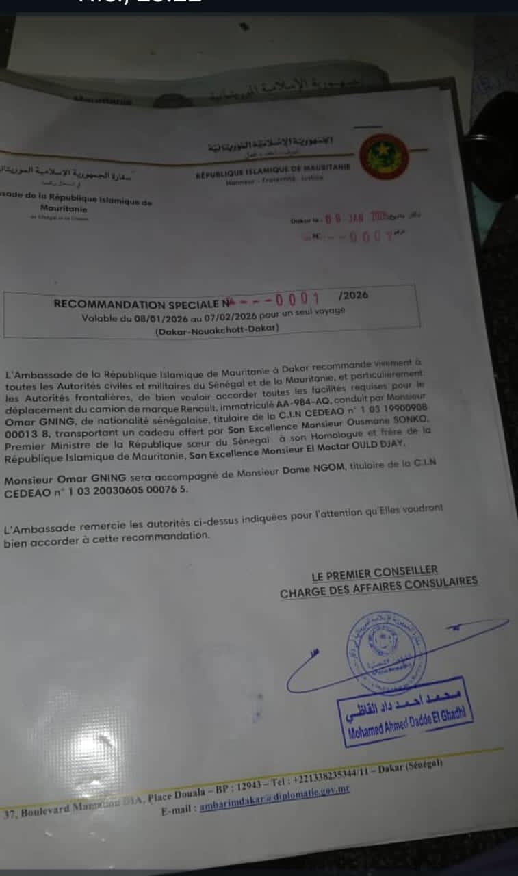 توصي جميع السلطات الأمنية للبلدين بفتح المجال أمام شاحنة محملة بهدية خاصة قدمها الوزير الأول السينغالي السيد عثمان سونكو ،