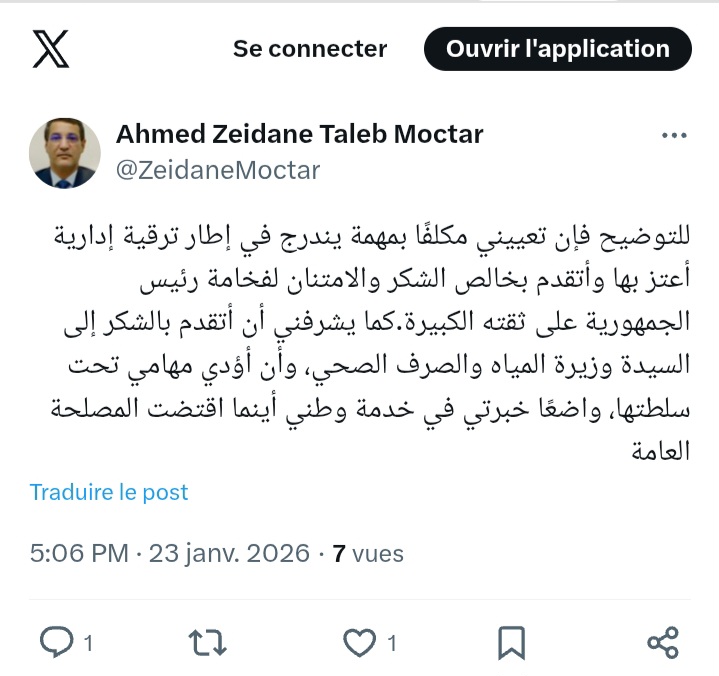 للتوضيح فإن تعييني مكلفا بمهمة يندرج في إطار ترقية إدارية أعتز بها واتقدم بخالص الشكر والامتنان لفخامة رئيس الجمهورية على ثقته الكبيرة.