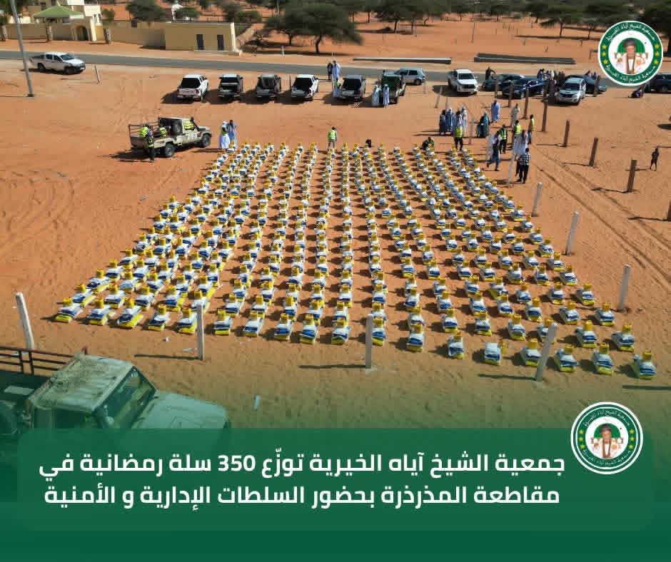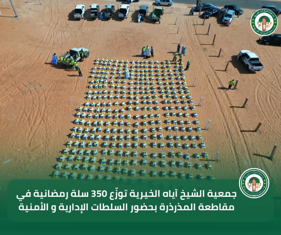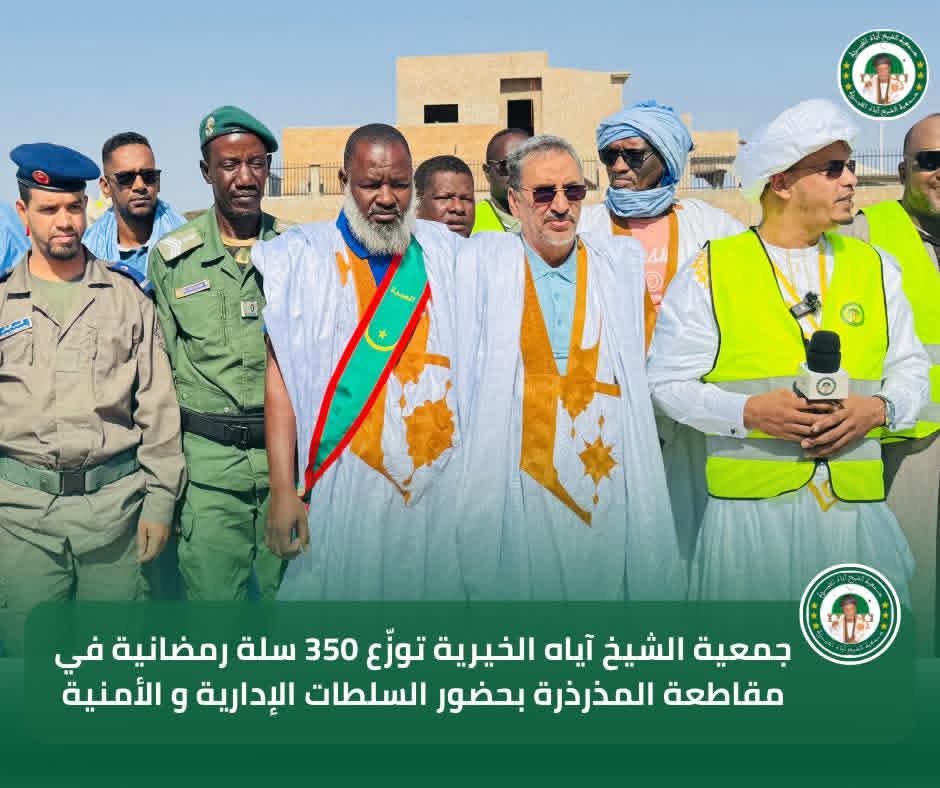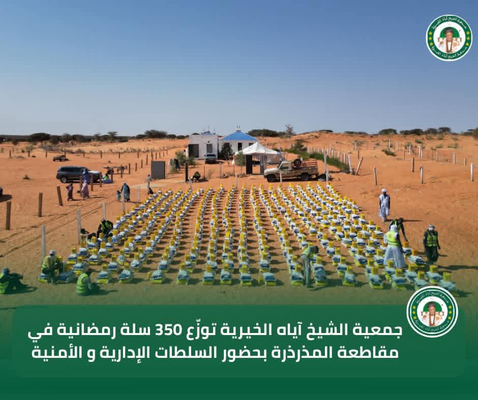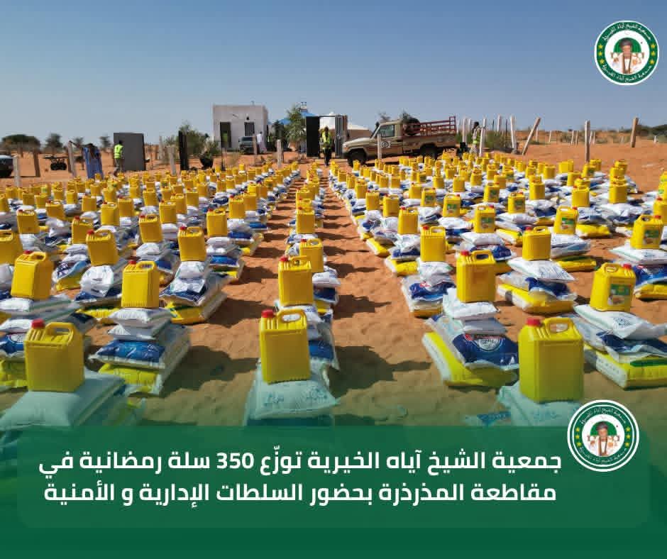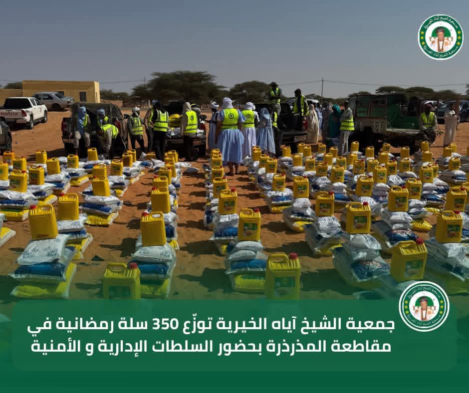 في إطار برنامجها السنوي للتوزيع الرمضاني لسنة 2026، تواصل جمعية الشيخ آياه الخيرية تدخلاتها الاجتماعية من مقاطعة المذرذرة، بحضور الحاكم والعمدة وممثلي السلطات الإدارية والأمنية، وبتوجيهات من رئيس الجمعية الشيخ الطالب بوي ولد الشيخ آياه، وبإشراف نائب رئيس الجمعية الشيخة العزّة منت الشيخ آياه، والأمينة العامة للجمعية ربيعة أحمد الهيبة الشيخ ماء العينين.