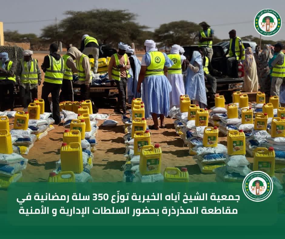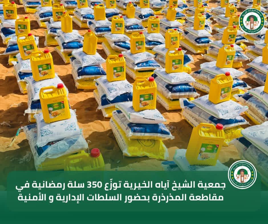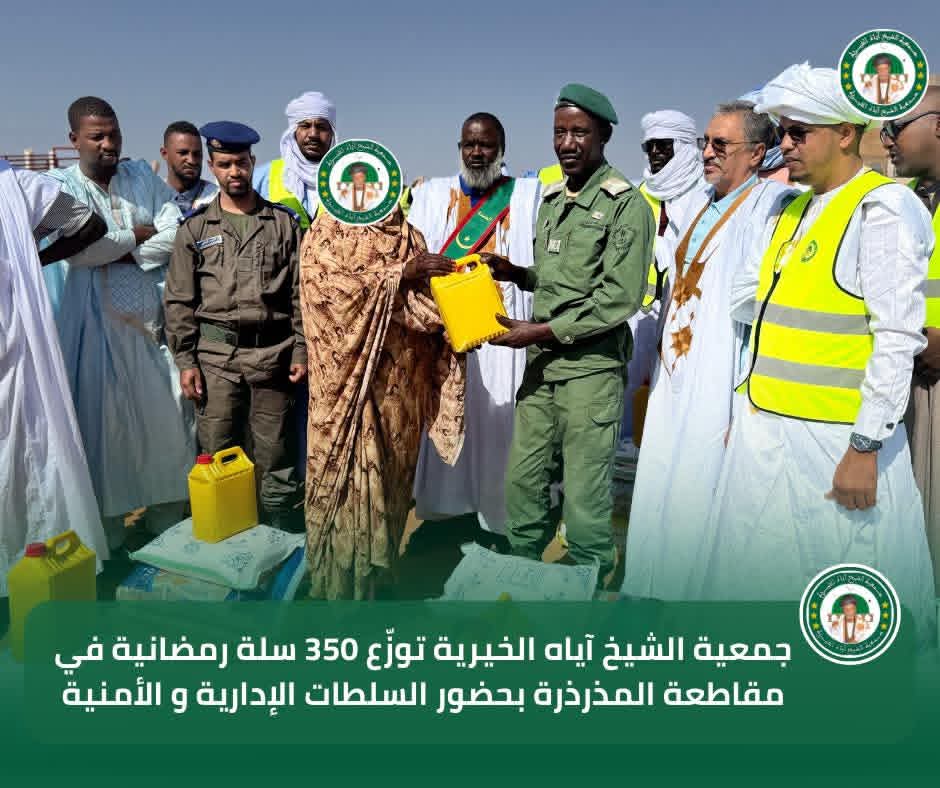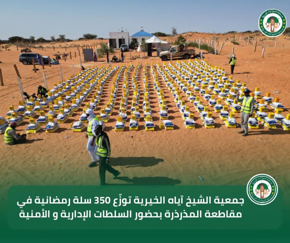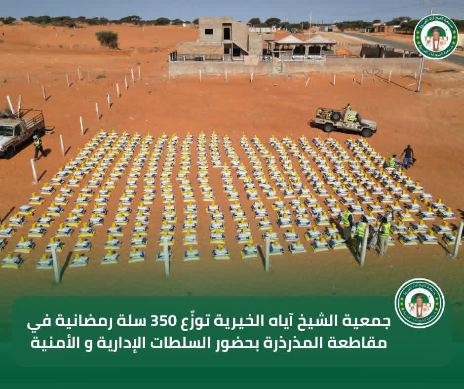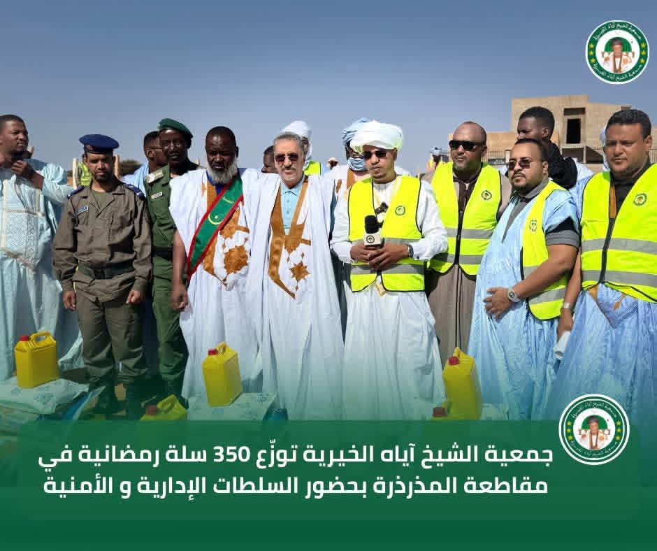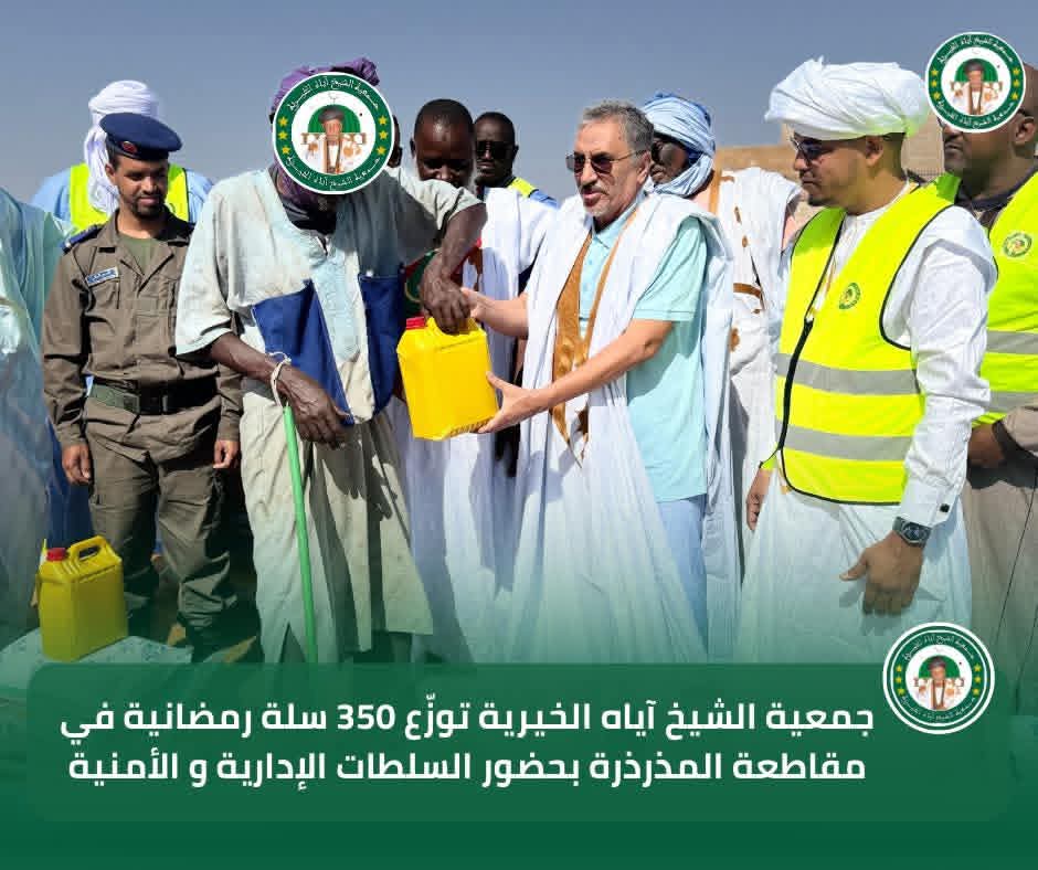 في إطار برنامجها السنوي للتوزيع الرمضاني لسنة 2026، تواصل جمعية الشيخ آياه الخيرية تدخلاتها الاجتماعية من مقاطعة المذرذرة، بحضور الحاكم والعمدة وممثلي السلطات الإدارية والأمنية، وبتوجيهات من رئيس الجمعية الشيخ الطالب بوي ولد الشيخ آياه، وبإشراف نائب رئيس الجمعية الشيخة العزّة منت الشيخ آياه، والأمينة العامة للجمعية ربيعة أحمد الهيبة الشيخ ماء العينين.