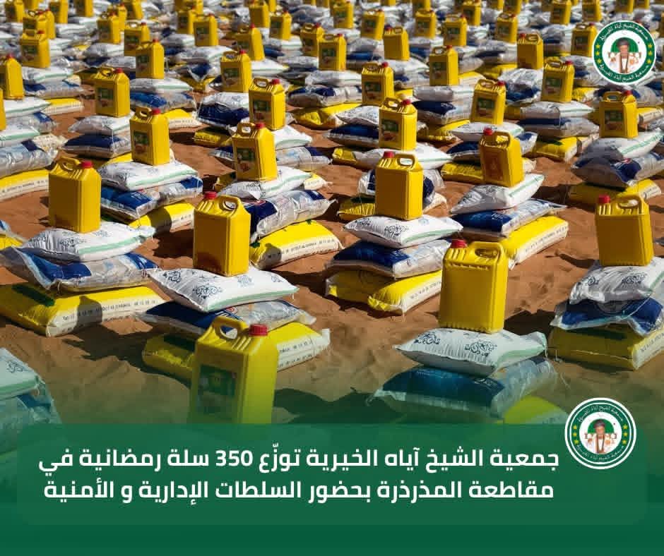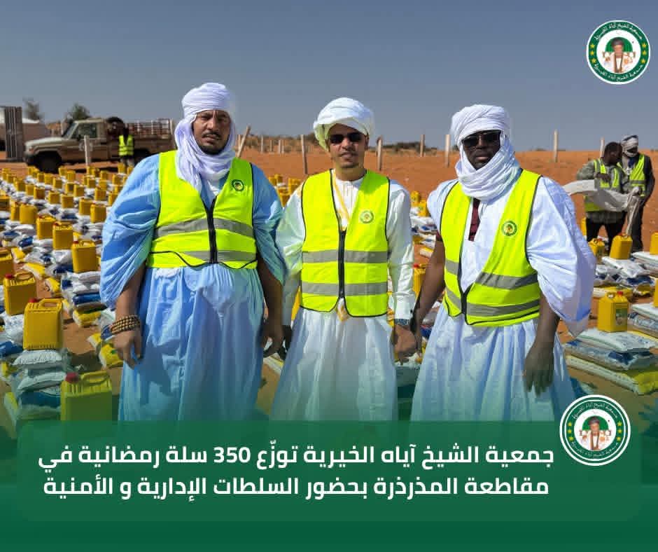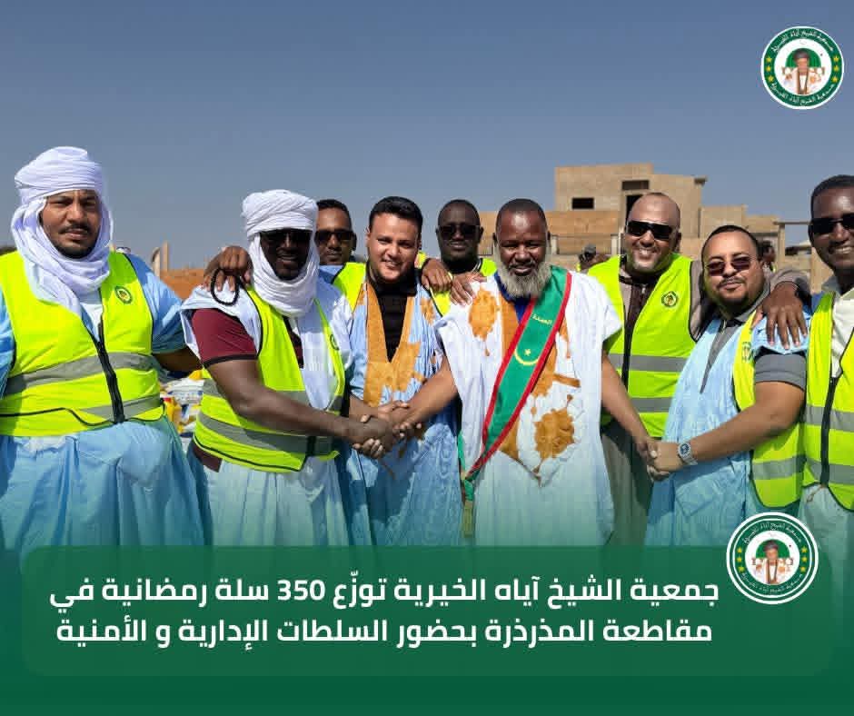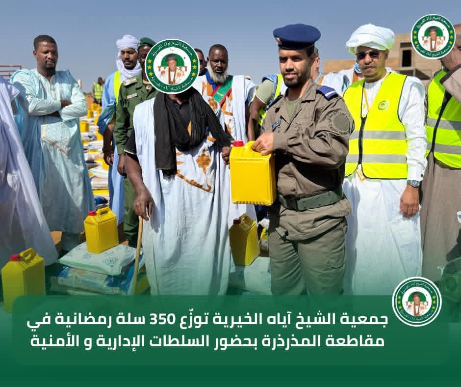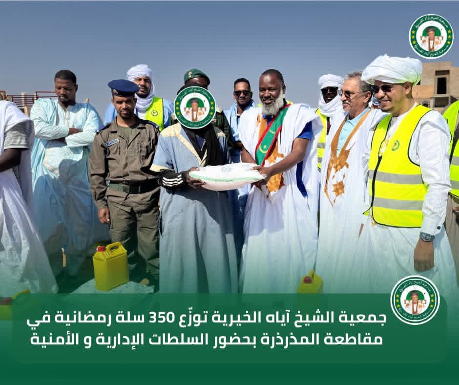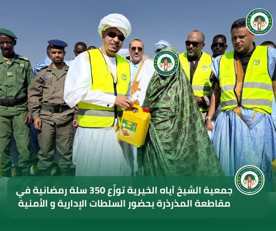 في إطار برنامجها السنوي للتوزيع الرمضاني لسنة 2026، تواصل جمعية الشيخ آياه الخيرية تدخلاتها الاجتماعية من مقاطعة المذرذرة، بحضور الحاكم والعمدة وممثلي السلطات الإدارية والأمنية، وبتوجيهات من رئيس الجمعية الشيخ الطالب بوي ولد الشيخ آياه، وبإشراف نائب رئيس الجمعية الشيخة العزّة منت الشيخ آياه، والأمينة العامة للجمعية ربيعة أحمد الهيبة الشيخ ماء العينين.
