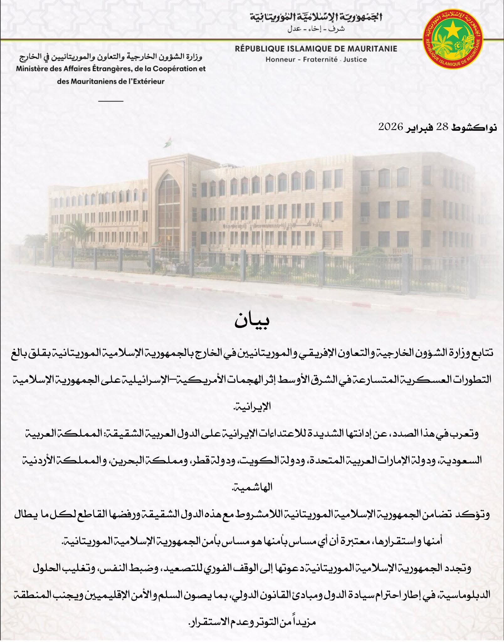 أعربت موريتانيا عن إدانتها "الشديدة للاعتداءات الإيرانية على الدول العربية الشقيقة: المملكة العربية السعودية، ودولة الإمارات العربية المتحدة، ودولة الكويت، ودولة قطر، ومملكة البحرين، والمملكة الأردنية الهاشمية".