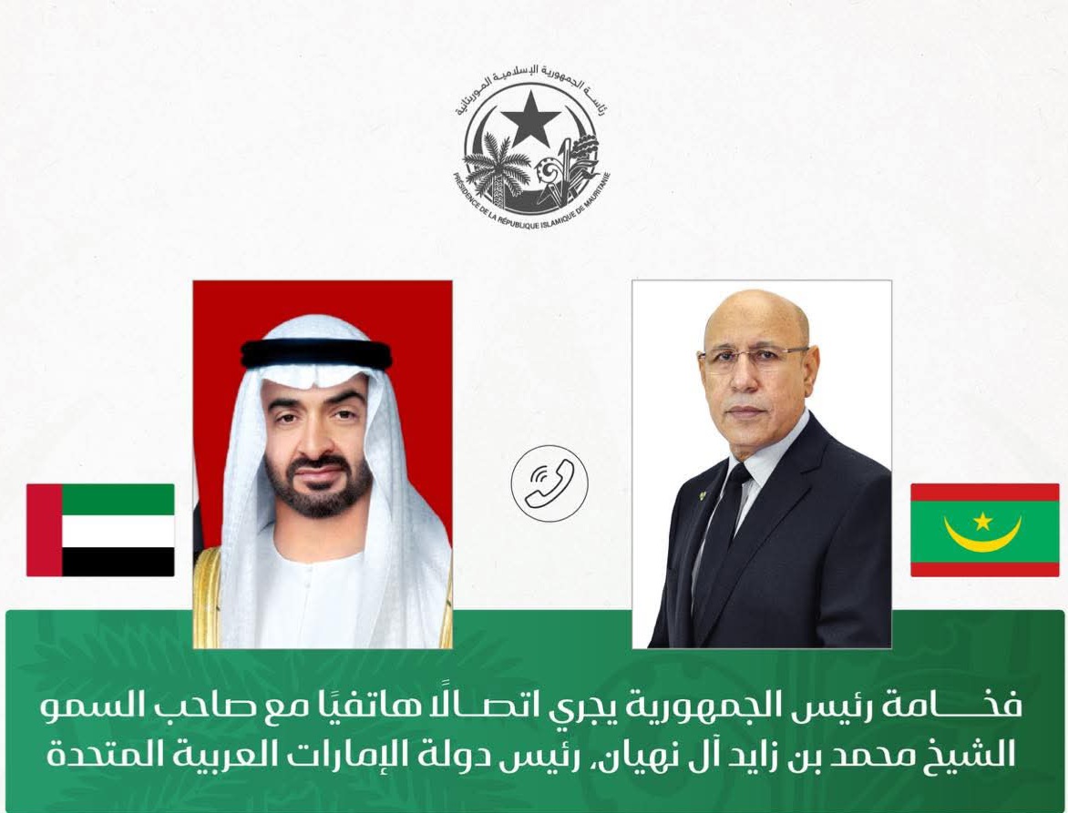 أجرى فخامة رئيس الجمهورية، السيد محمد ولد الشيخ الغزواني، اليوم الأحد، اتصالا هاتفيا بأخيه صاحب السمو الشيخ محمد بن زايد آل نهيان، رئيس دولة الإمارات العربية المتحدة الشقيقة، وذلك على إثر الاعتداءات الصاروخية التي استهدفت أراضي دولة الإمارات.