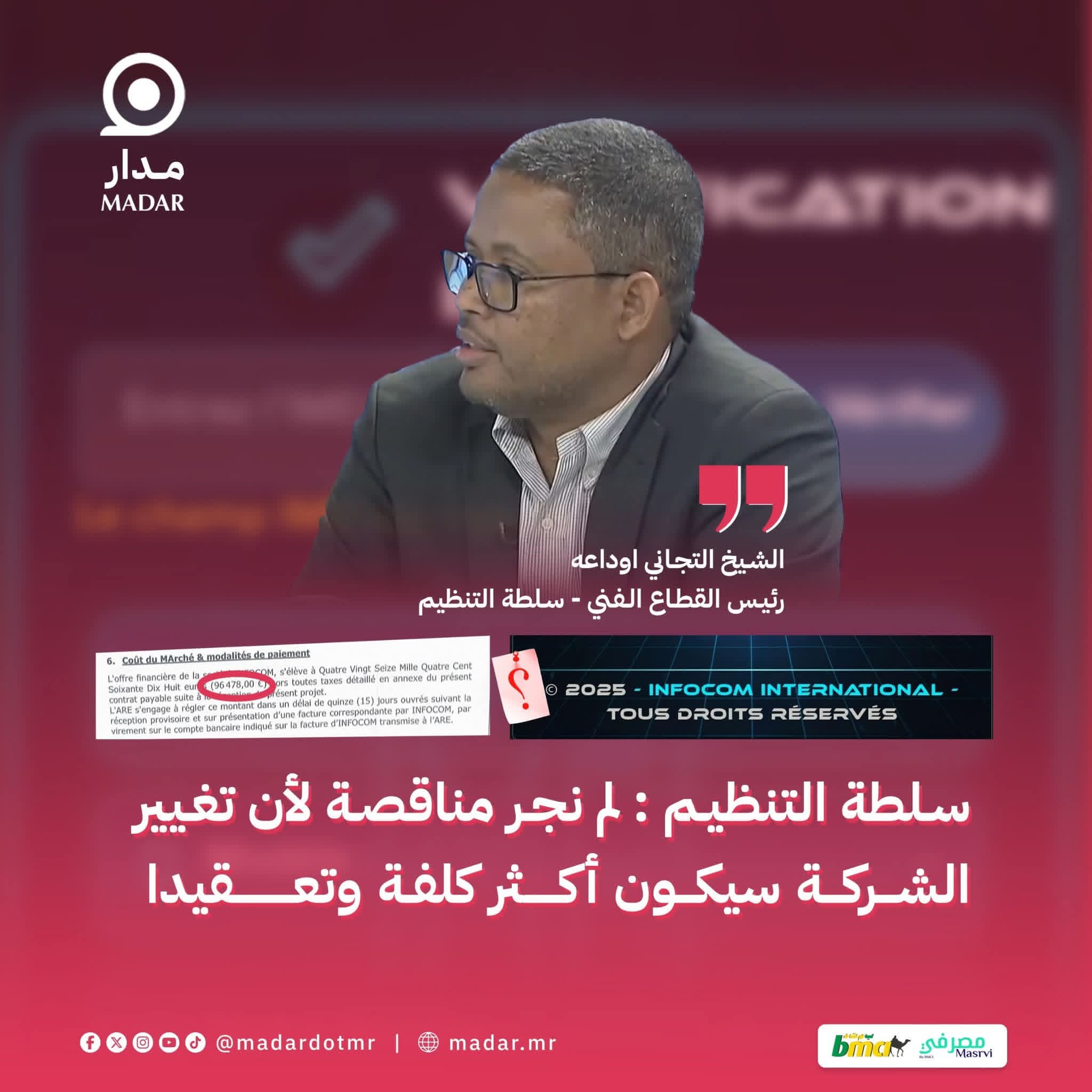 وأوضح ولد أوداعه، في تصريح لــ "مدار"، أن كلفة الصفقة تبلغ 96 ألف يورو، وتتعلق بتكلفة تكملة وحدة نمطية جديدة ضمن المنصة القائمة لدى السلطة، مؤكدا أن العقد لا يشترط دفع أي مبلغ مقدم، وأنه لم يتم صرف أي أوقية حتى الآن.