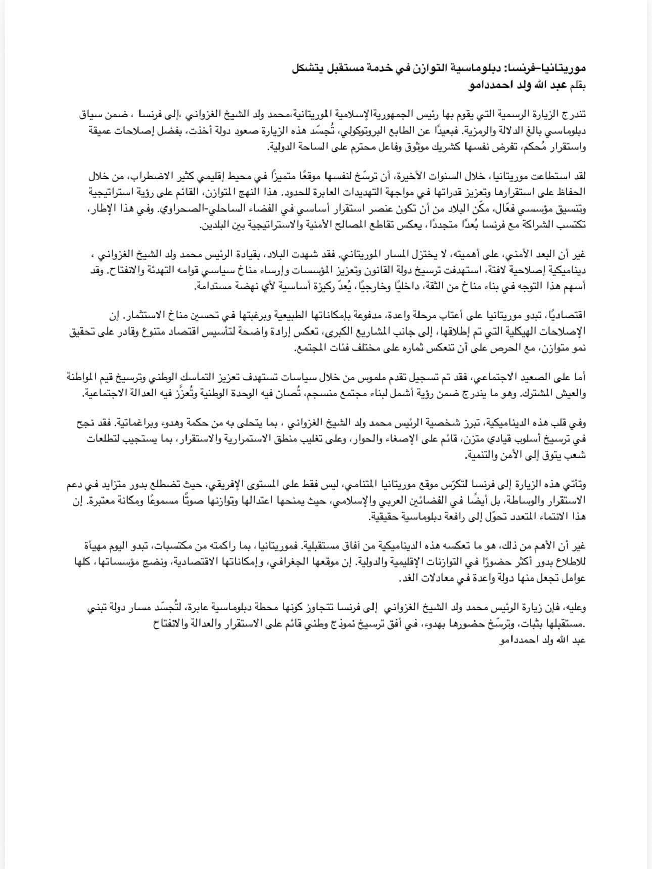 وتأتي هذه الزيارة إلى فرنسا لتكرّس موقع موريتانيا المتنامي، ليس فقط على المستوى الإفريقي، حيث تضطلع بدور متزايد في دعم