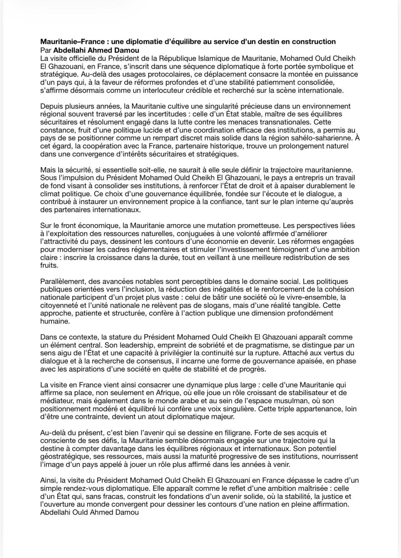 وعليه، فإن زيارة الرئيس محمد ولد الشيخ الغزواني إلى فرنسا تتجاوز كونها محطة دبلوماسية عابرة، لتُجس ّ د مسار دولة تبني