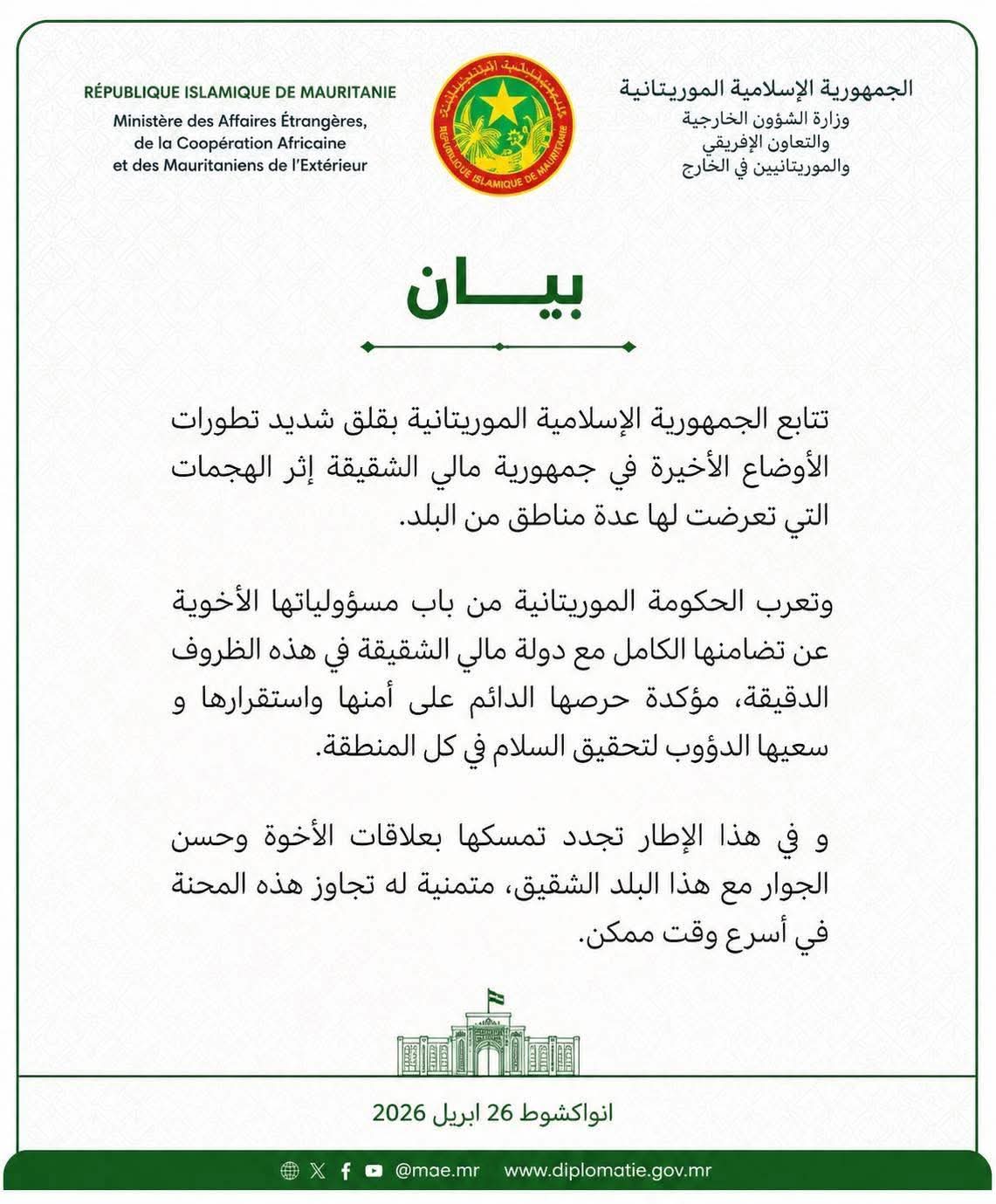 وتعرب الحكومة الموريتانية من باب مسؤولياتها الأخوية عن تضامنها الكامل مع دولة مالي الشقيقة في هذه الظروف الدقيقة، مؤكدة حرصها الدائم على أمنها واستقرارها وسعيها الدؤوب لتحقيق السلام في كل المنطقة.