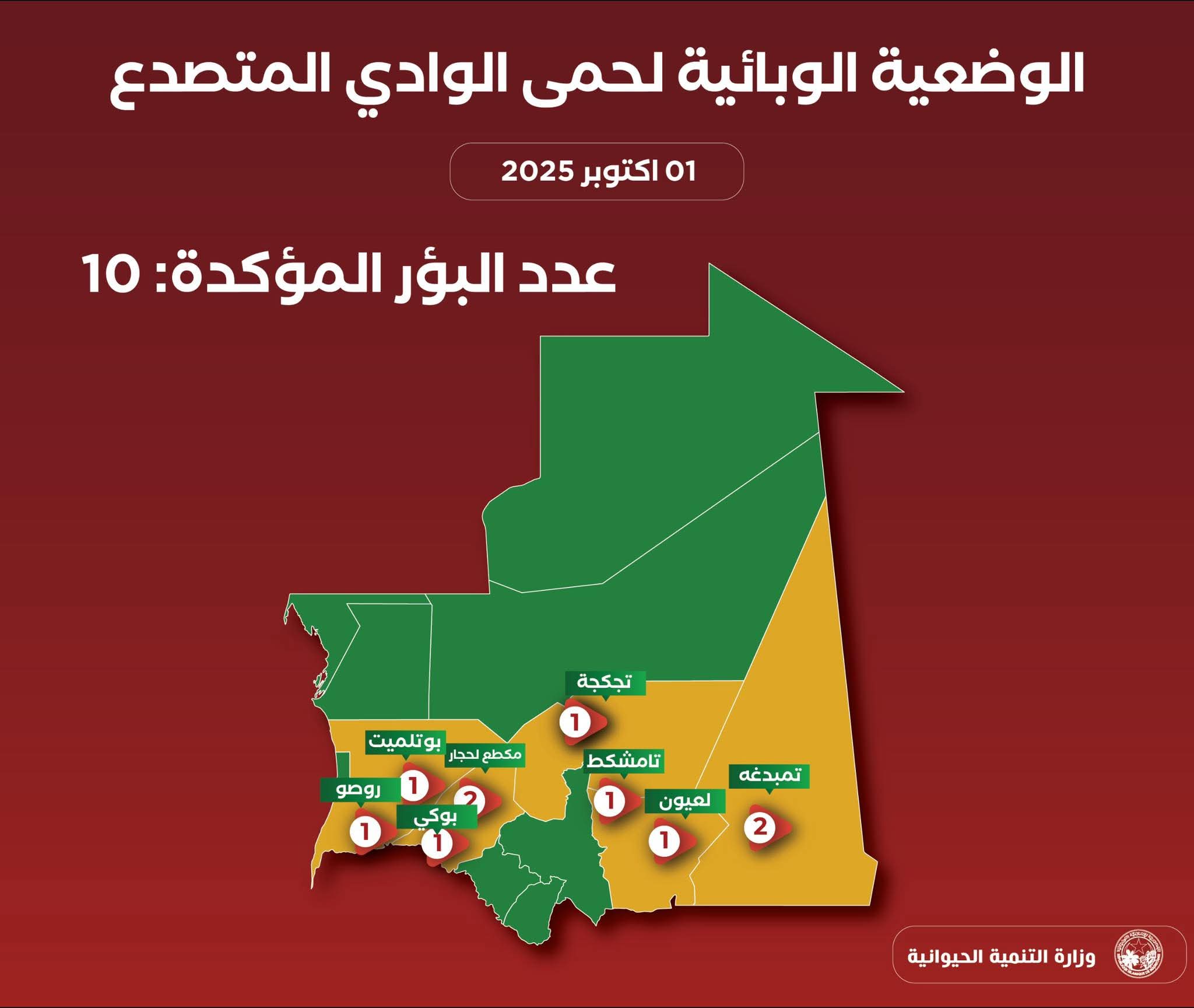 وقد سجلت المصالح البيطرية، حتى يوم 1 اكتوبر 2025، ما مجموعه 10بؤر موزعة على 8 مقاطعات تتبع لخمس ولايات، كما هو موضح في الصورة.