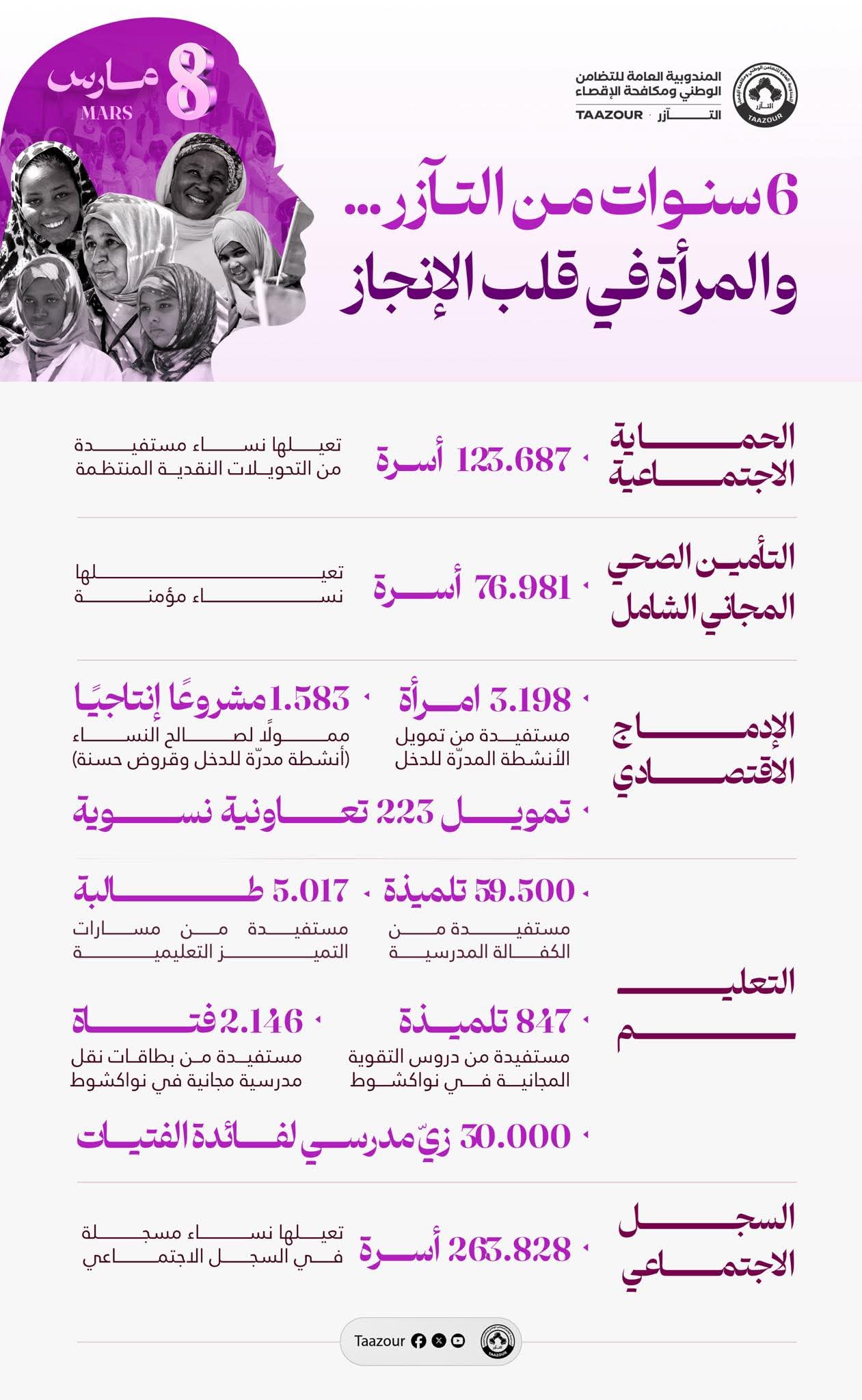 خلال ست سنوات من العمل الميداني، كانت المرأة في صميم تدخلات المندوبية العامة للتضامن الوطني ومكافحة الإقصاء «التآزر»، باعتبارها ركيزة أساسية للأسرة والمجتمع، وشريكًا محوريًا في مسار التنمية وتعزيز التماسك الاجتماعي.