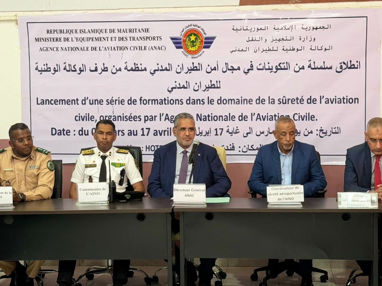 أشرف المدير العام للوكالة الوطنية للطيران المدني، السيد باب أحمد محمد باب أحمد، على افتتاح سلسلة من الدورات التكوينية المتخصصة في مجال أمن الطيران المدني، المنظمة لفائدة القطاعات الأمنية العاملة بمطار نواكشوط الدولي "أم التونسي"، وذلك خلال الفترة الممتدة من 09 مارس إلى 17 إبريل 2026.