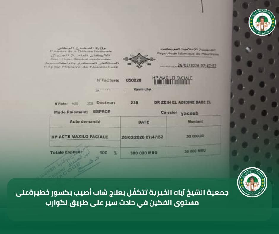 في إطار تدخلاتها الإنسانية المتواصلة، تكفّلت جمعية الشيخ آياه الخيرية بعلاج شاب متعفف تعرّض لحادث سير على طريق لگوارب، ما أدى إلى إصابته بكسور على مستوى الفكين استدعت تدخلاً جراحيًا عاجلاً.