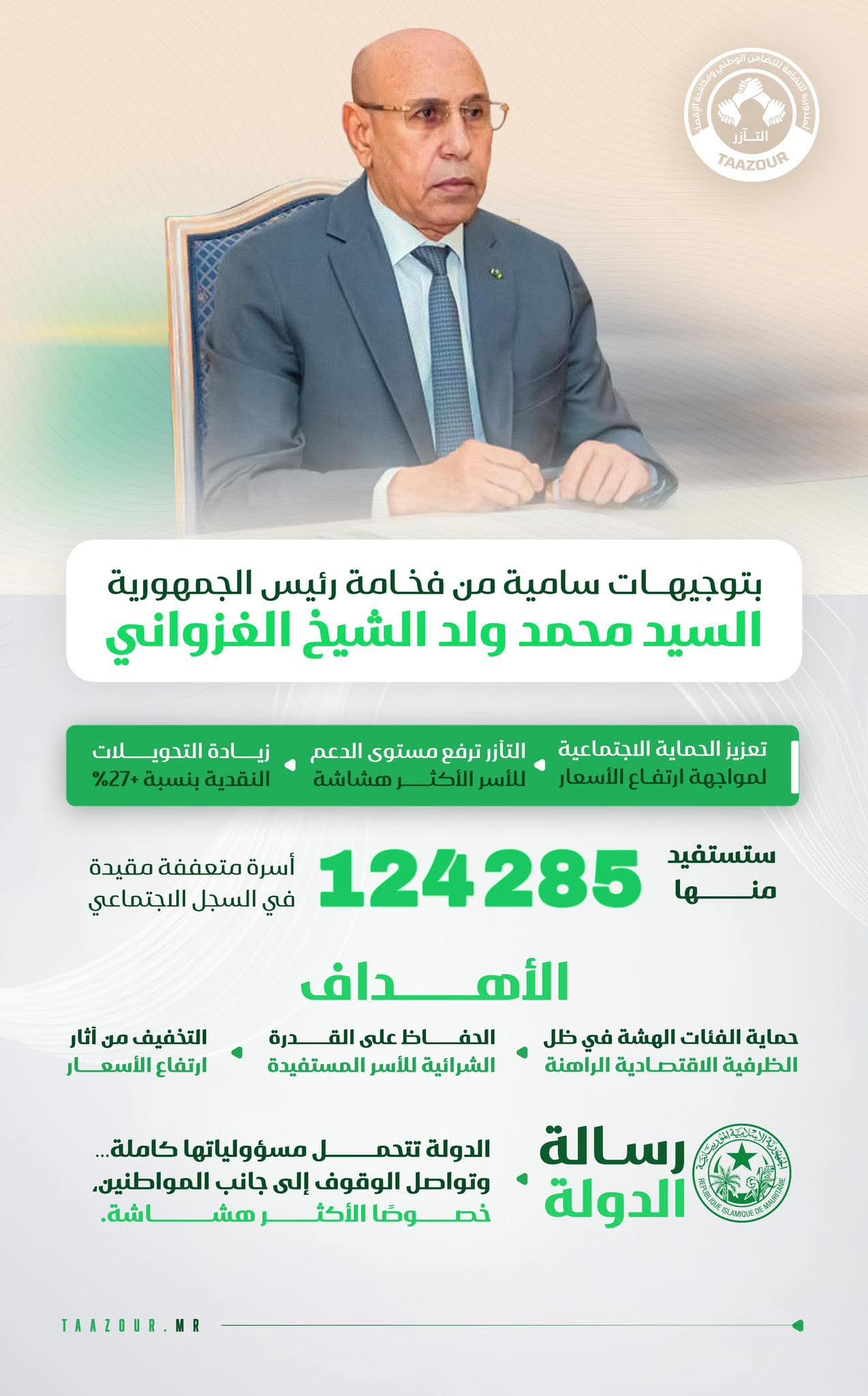 بتوجيهات من فخامة رئيس الجمهورية السيد محمد ولد الشيخ الغزواني: تعزيز الحماية الاجتماعية عبر رفع التحويلات النقدية المنتظمة بأكثر من 27% لصالح 124,285 أسرة.