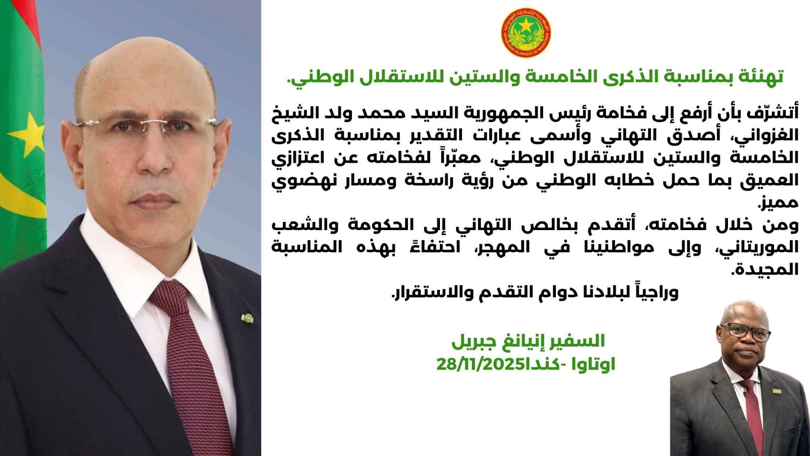 اتشرف بأن ارفع إلى فخامة رئيس الجمهورية السيد محمد ولد الشيخ الغزواني أصدق التهانب وأسمى عبارات التقدير بمناسبة الذكرى الخامسة والستين لعيد الاستقلال الوطني؛ معبرا لفخامته عن اعتزازي العميق بما حمل خطابه الوطني من رؤية راسخة ومسار نهضوي مميز.