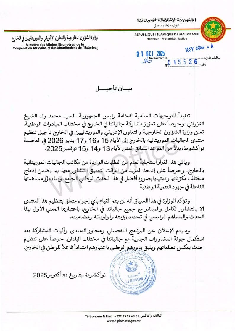 أعلنت وزارة الشؤون الخارجية والتعاون الإفريقي والموريتانيين في الخارج، الجمعة، تأجيل تنظيم منتدى الجاليات الموريتانية في الخارج إلى أيام 15 و16 و17 يناير 2026 في العاصمة نواكشوط.