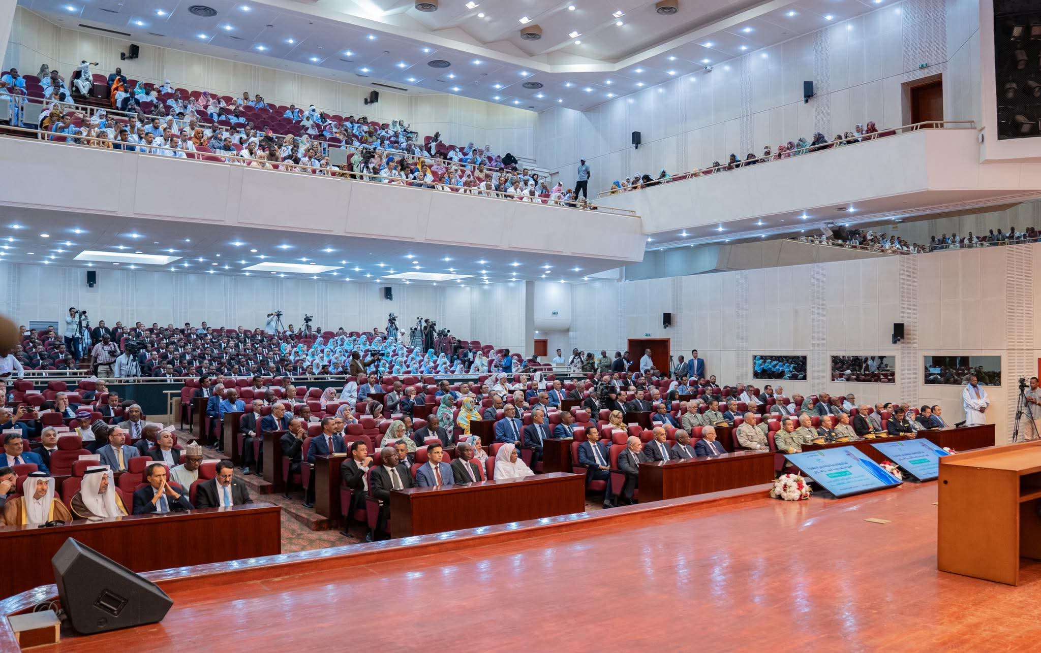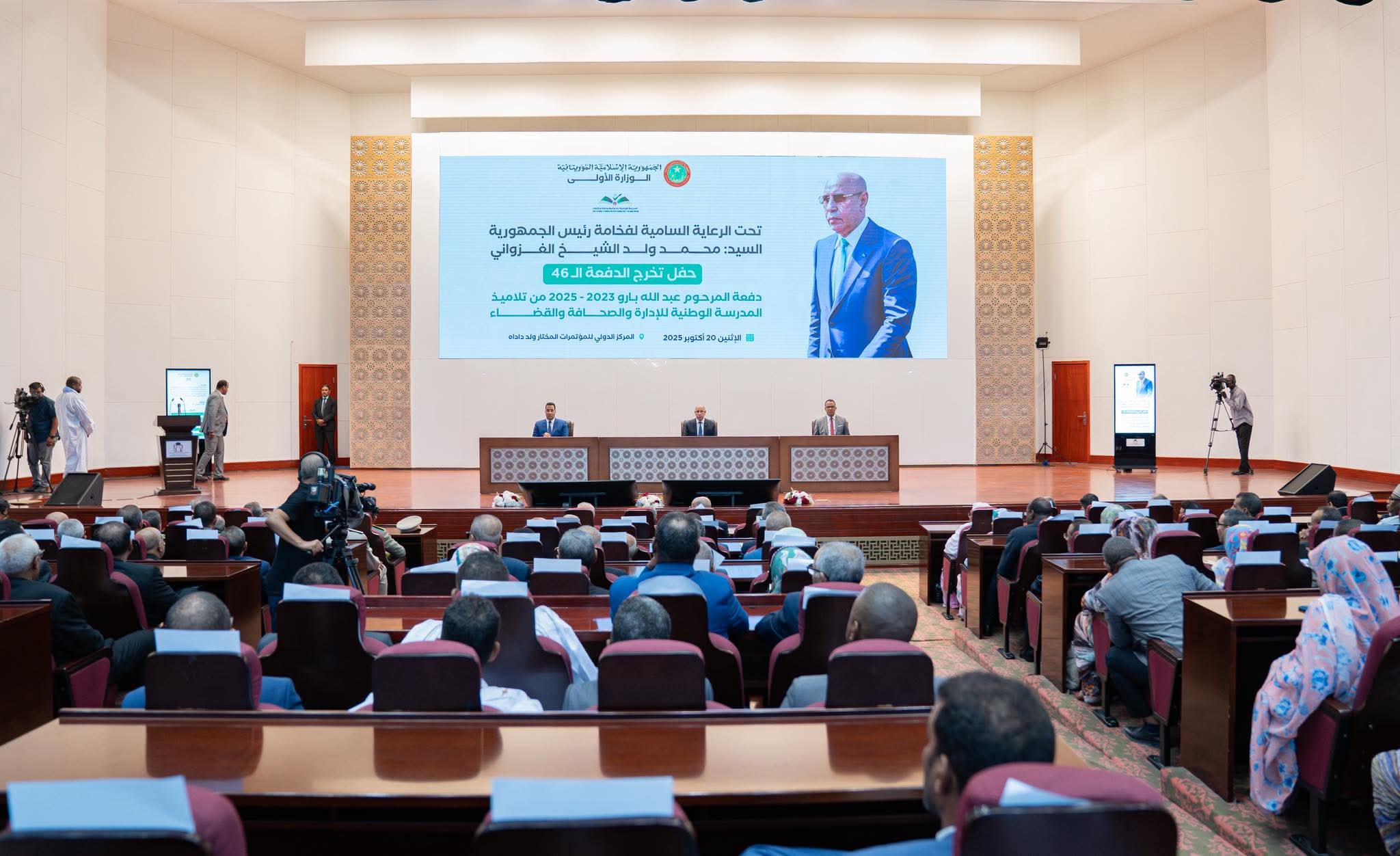 أشرف فخامة رئيس الجمهورية، السيد محمد ولد الشيخ الغزواني، يشرف من المركز الدولي للمؤتمرات (المختار ولد داداه )، على فعاليات حفل تخرج الدفعة ال46 من طلاب المدرسة الوطنية للإدارة والصحافة والقضاء.