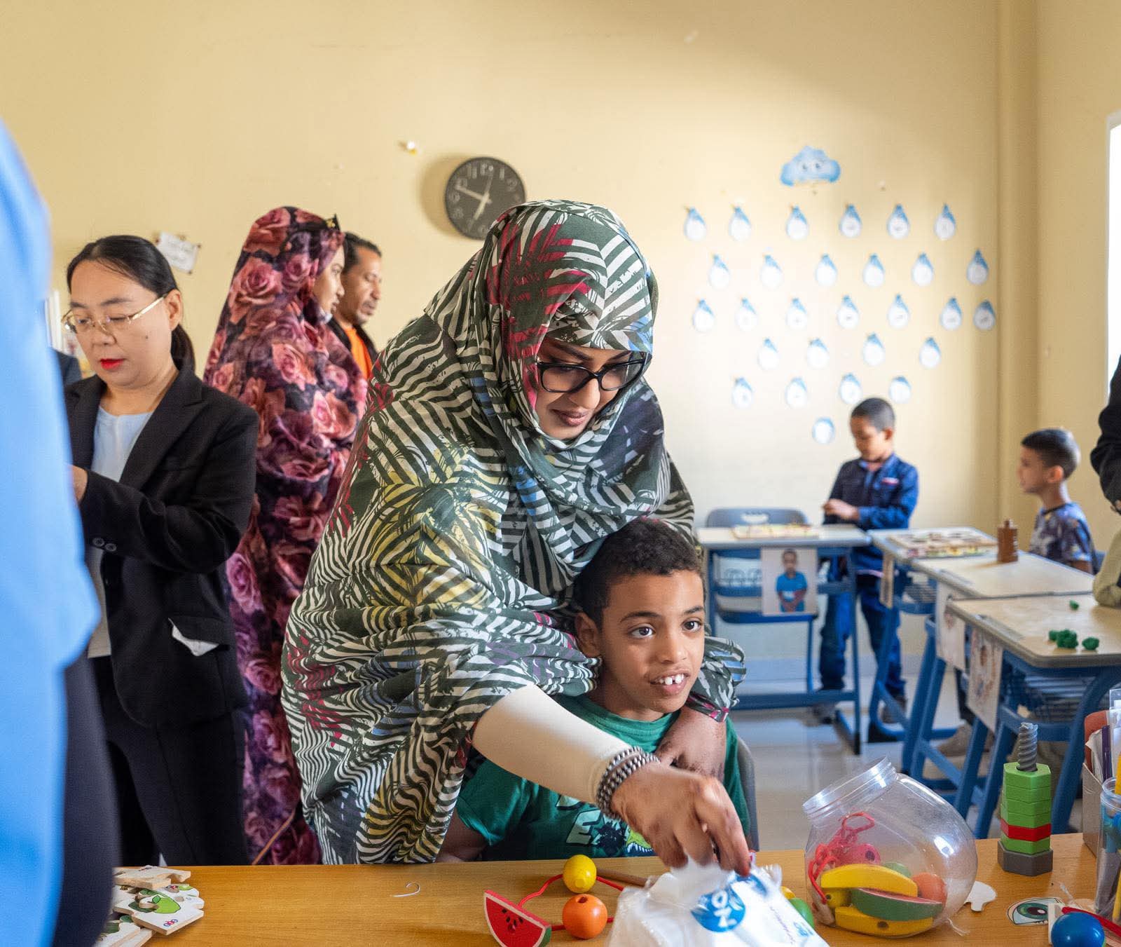 وتجولت السيدة الأولى، رفقة سفير جمهورية الصين الشعبية المعتمد لدى موريتانيا، السيد تانغ تشونغ دونغ، داخل أجنحة المركز، حيث تلقت شروحا مفصلة من القائمين عليه، من أساتذة ومشرفين، حول ظروف سير العمل ومستوى الخدمات المقدمة، ومدى استجابة المركز لاحتياجات الأطفال المصابين بطيف التوحد.