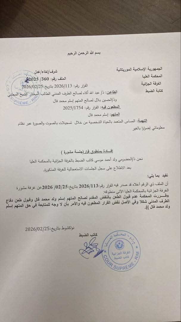 والشكر موصول، وبصفة خاصة، للمحامي الشهم الحسن ولد بلال، الذي أرفع له القبعة تقديرًا للجهد الكبير والدعم الصادق الذي قدمه لي، وهو فضل لن أنساه ما حييت.
