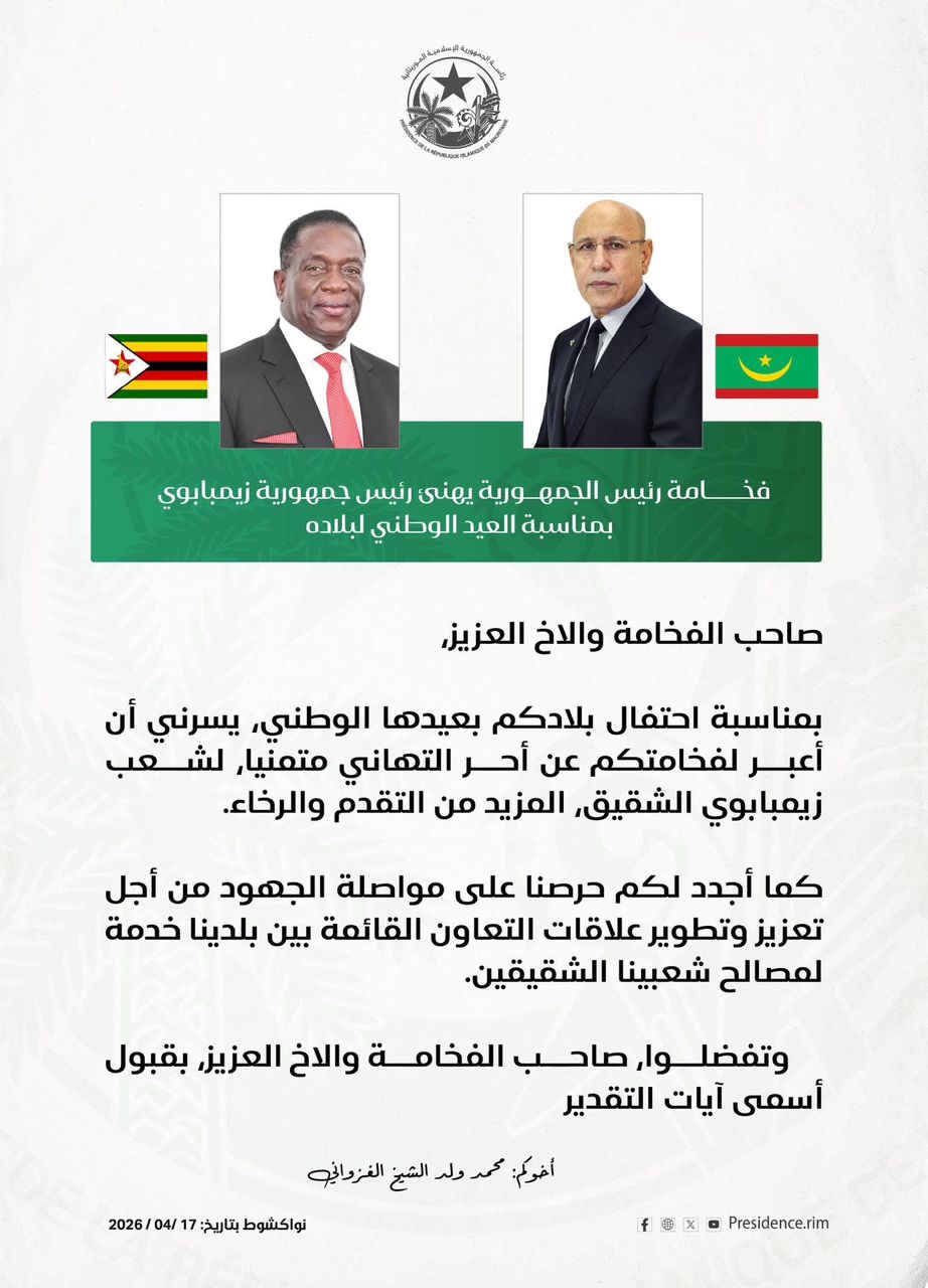 وجه فخامة رئيس الجمهورية، السيد محمد ولد الشيخ الغزواني، اليوم الجمعة، برقية تهنئة إلى فخامة السيد إمرسون منانغاغوا، رئيس جمهورية زيمبابوي، وذلك بمناسبة احتفال بلاده بعيدها الوطني.